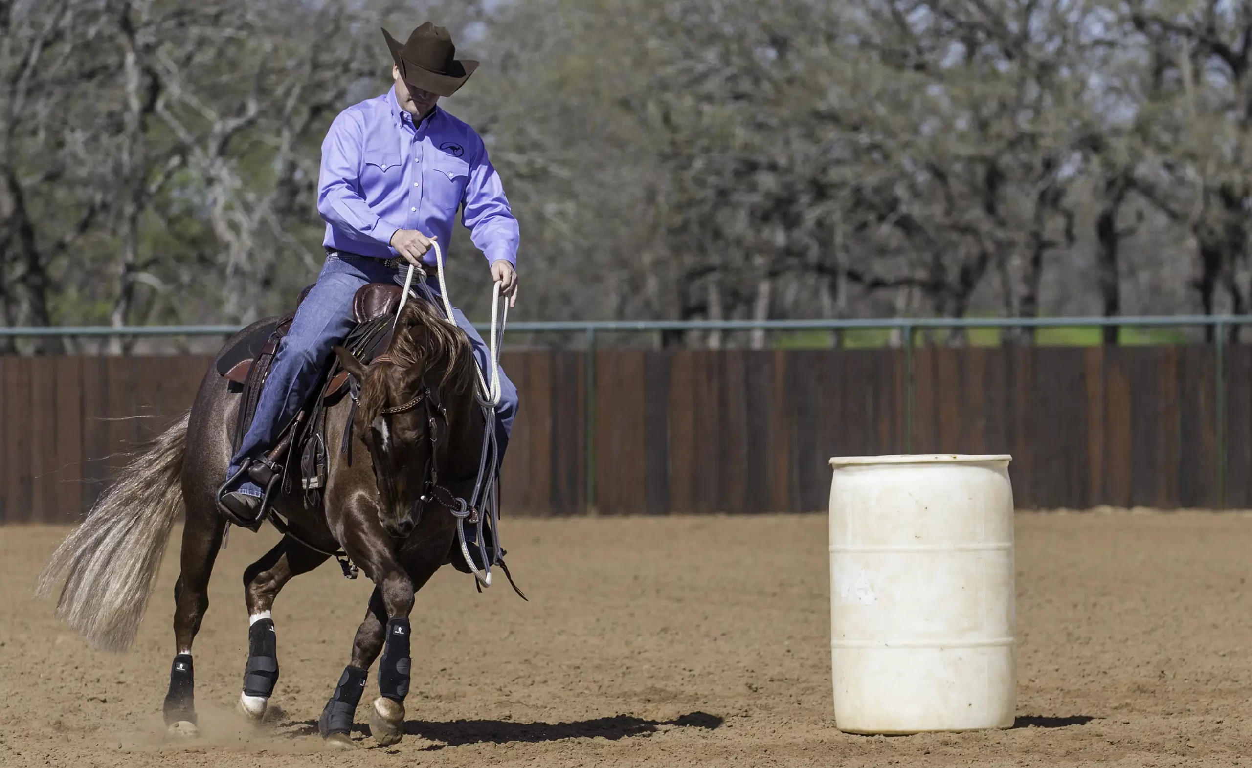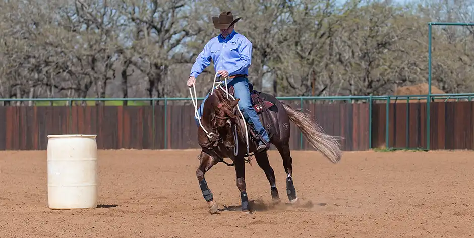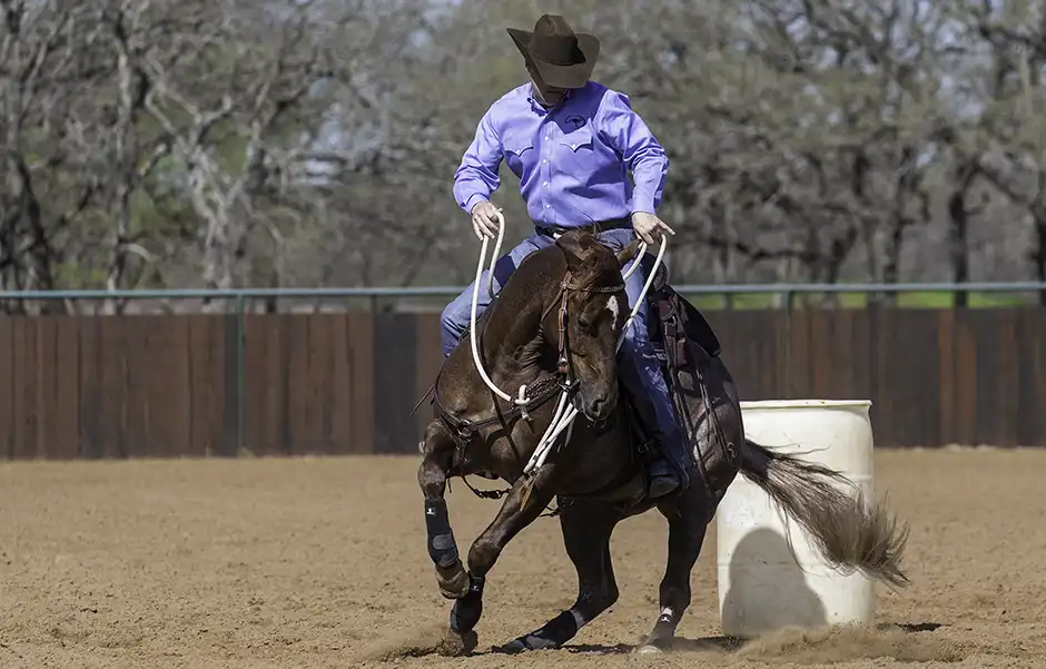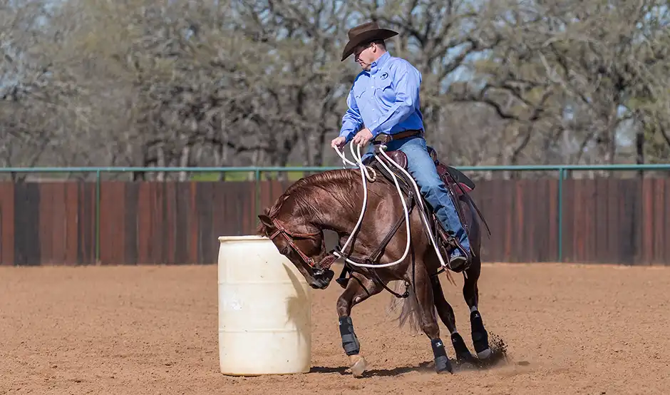 Bridle your horse up and trot a 20-foot circle around the barrel. Ask the horse to counterbend around the barrel by picking up on the direct rein and pulling it up and over so that it is in line with your belly button. The rein should just be pressing against the horse’s neck. You want to tip his nose so that you can just see his eye.
