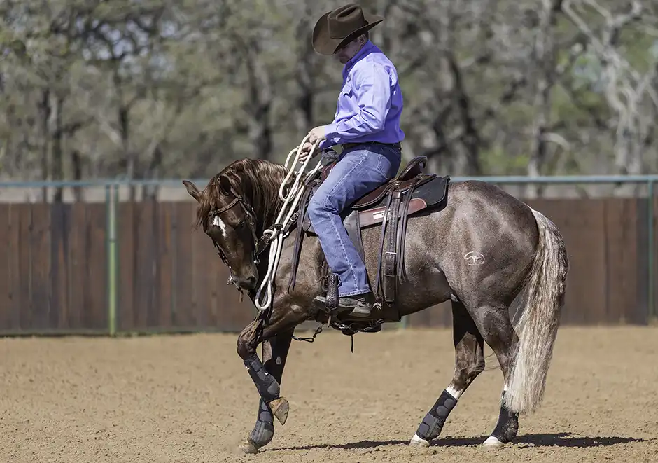 Since the horse is already shaped correctly for the rollback, meaning that his nose is tipped in the direction you’ll ask him to turn in, all you have to do is change the position of your legs to cue him to roll back.