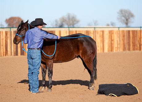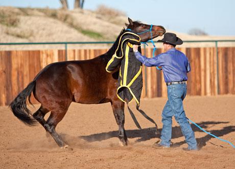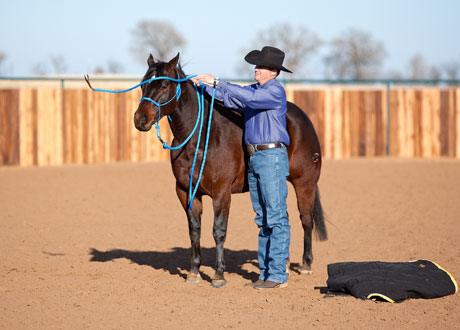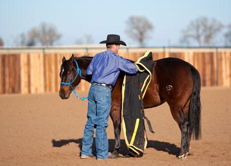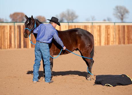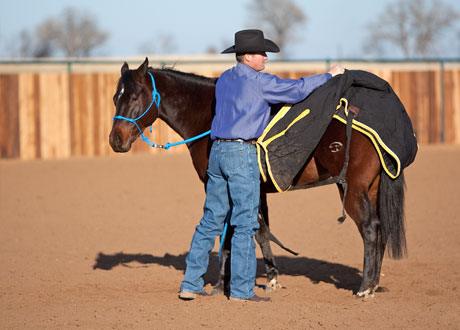 Desensitize your horse to the blanket when he wants to stand still—after you have worked him and he’s using the thinking side of his brain. Don’t take a horse that has been in a stall for a couple of days and is full of beans and try to desensitize him to the blanket. He’ll run around and not want any part of standing still. Set yourself up for success and desensitize your horse when he’s tired and wanting to stand still. If you just do desensitizing without having the horse’s respect and attention from groundwork, all the information you give him won’t last. It’ll go in one ear and out the other. The secret is to desensitize a horse between groundwork exercises. That way, he looks forward to being desensitized because he gets to air up and relax.