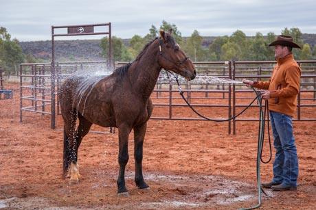 Before touching the horse with water, build his confidence by spraying the water around him first.