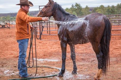 When you’re ready to spray the horse with water, start on his topline, the least sensitive area on his body.