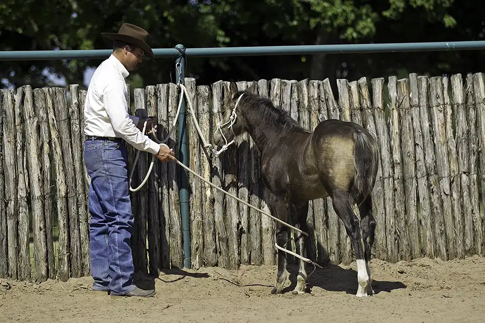 Before teaching a horse how to stand tied up, he has to be prepared for the experience, meaning that he knows how to soften and yield to pressure. I prepare my horses to be tied up by teaching them the Fundamentals groundwork exercises. When I’m confident that the horse understands that when he feels pressure from the halter behind his poll he needs to move forward off of it rather than resist it, then I work on teaching him to tie.