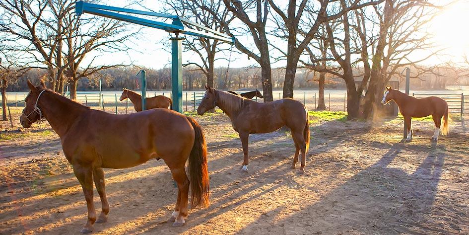The horses on the ranch spend three to four hours each day tied up to Patience Poles.