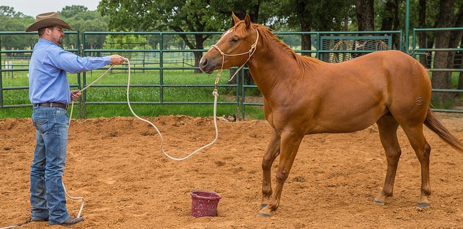 After you’ve worked the horse next to the feed bucket and he’s responding well, let him rest next to it. Stop him so that he has two eyes on you and let him rest with slack in the lead rope. If he goes to look away from you, get his attention back on you by bumping on the lead rope. If he tries to eat the feed, immediately put his feet to work.