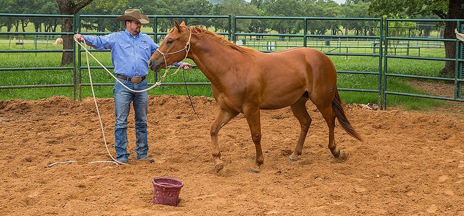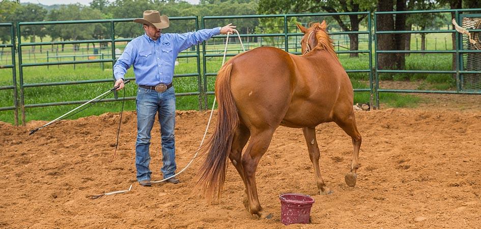 Place a bucket of grain in the center of the roundpen. Then practice the Sending Exercise in front of the bucket of grain. You’ll direct the horse to move from one side of you to the other, yielding his hindquarters when he passes you.