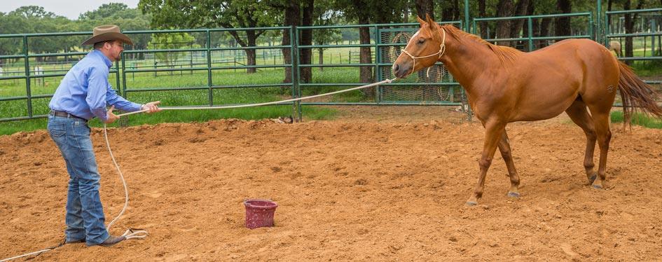 Dare the horse to get at the feed. Don’t babysit. You want him to learn that even when there’s feed around, you still call the shots. The feed is the last thing he should be interested in, because every time he tries to get some, you make him hustle his feet and sweat.