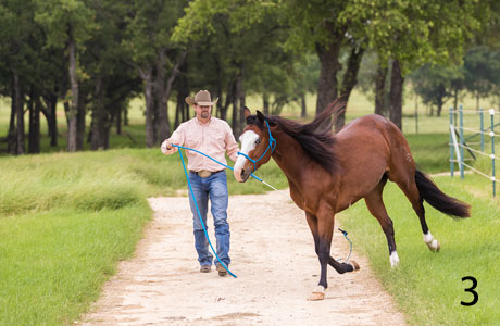 6. Just as much as I want my horses to lead respectfully beside me, I want them to lead well behind me. I hate feeling as if I’m dragging a horse behind me like a stolen dog. If I walk off or pick up my pace, I want my horse to be right there with me, coming off the halter pressure but staying a respectful distance away from me, not breathing down my neck. To teach a horse to lead behind me, I use the Intermediate exercise Leading Behind. It teaches a pushy horse that wants to run over top of you to respect your space, and it gets a lazy horse that drags behind you to come forward off light halter pressure. I find that this exercise works best when you do it at random times when the horse is least expecting it. It’s a test to see how quick he is to come off the halter pressure and follow you. When you’re leading him to or from the pasture, jog off and see what he does. You’ll notice that if you practice the exercise when the horse is least expecting it, he’ll start to pay more attention to you because he knows that at any time you might make his feet move.