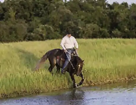 Be aware that some horses will try to run into large bodies of water. If your horse does that, don’t get dragged in behind him!
