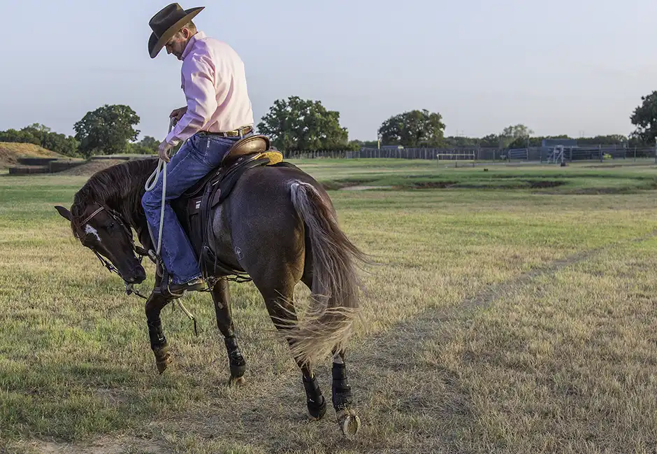 A rollback is a physically demanding maneuver for a horse to do when he does it correctly. Eventually, as you circle the puddle and roll back into it, the horse will get lazier and stop putting in as much effort, which will cause him to get closer and closer to the puddle until one of his hooves steps in the water. Every time he steps in the water and doesn’t get killed, he realizes that he can be a little more confident. The next time you turn him, he might take two steps into the puddle, but he doesn’t have to panic because you’ll turn him right back out of the water again. Go around the other way. Then turn again. Now he takes three steps into the water. Eventually, he’ll get a little lazier so that when you turn, instead of doing a stop and a rollback, he’ll actually cut through the center of the puddle.