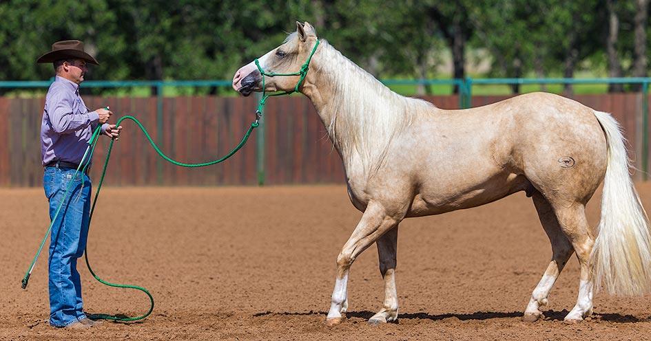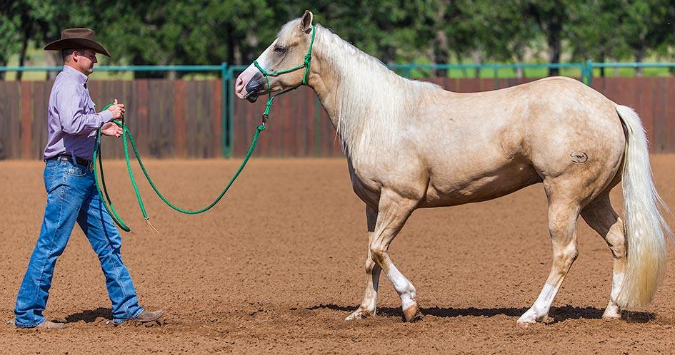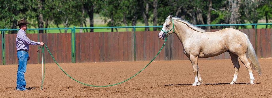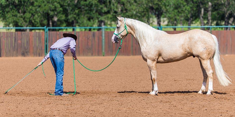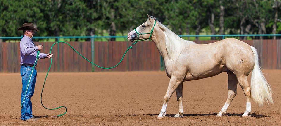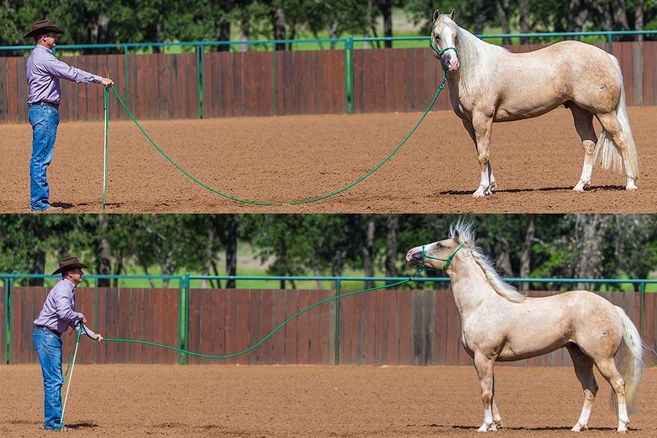 It’s important that you comb the rope with your hands so that you’re gently encouraging the horse to approach you. If you just pull on the lead rope, he’s likely to brace his feet and lean against the pressure.