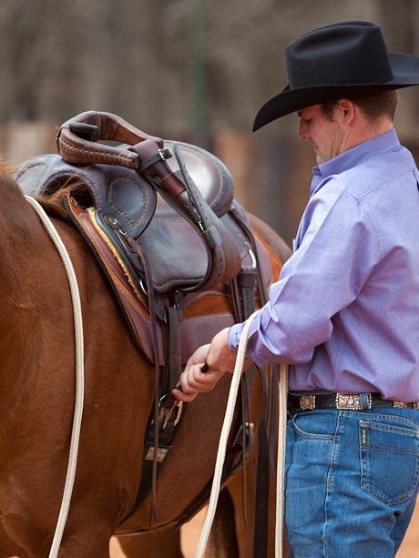 When you saddle the horse after doing groundwork, mirror the work you did with the rope. Pick up the front cinch and pull it up kind of snug, then release it a few inches; pull it up snug, then release it. This lets your horse know what’s coming, so you don’t just walk up to him, and jerk the girth up tight. I’ll continue pulling the cinch up snug and releasing it until the horse accepts it and is totally relaxed.