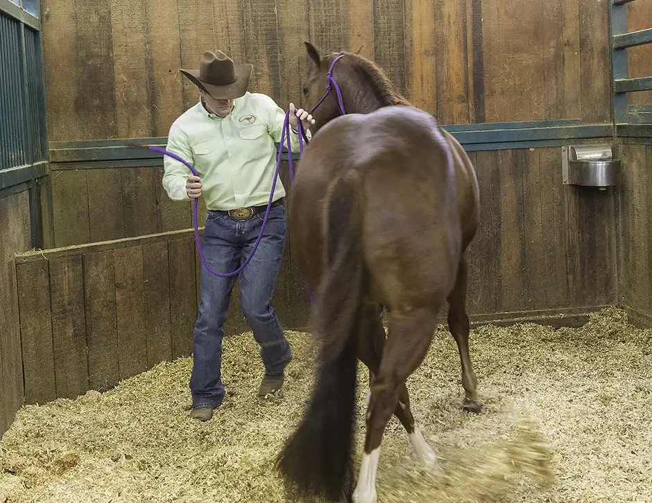 Then, before you get back in the saddle, doublecheck his “go” button by practicing some Lunging for Respect Stage Two. As soon as you point with your hand to tell the horse to move, he should hustle his feet out onto the circle. If he doesn’t, use the end of your mecate to make him feel uncomfortable for ignoring you. A good rule of thumb to remember is if your horse has an attitude about moving forward when you work with him on the ground, or he’s lazy, his response is only going to get worse under saddle.