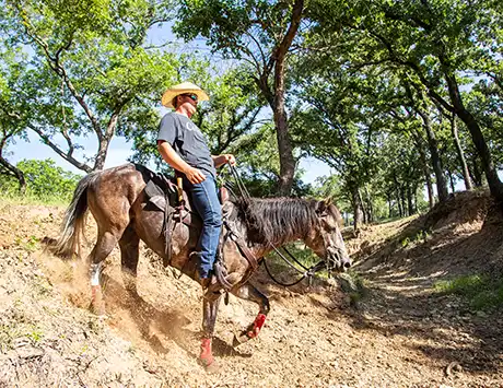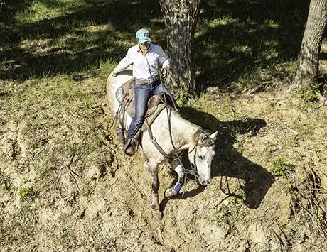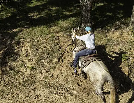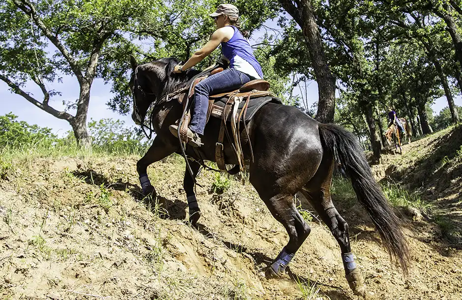 If you want your horse to handle hills well, you have to train him to do so. Left on their own, most horses rush up and down inclines. The creek bed at the ranch is a perfect place to practice training a horse to handle hills well because it offers varying degrees of difficulty.