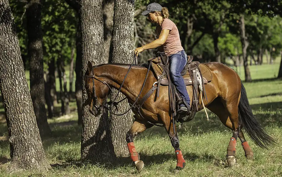 A good rule of thumb is to complete four circles around two trees, or whatever objects you can find to circle around. If there are no objects around you, bend your horse in four circles to the right and then four circles to the left.
